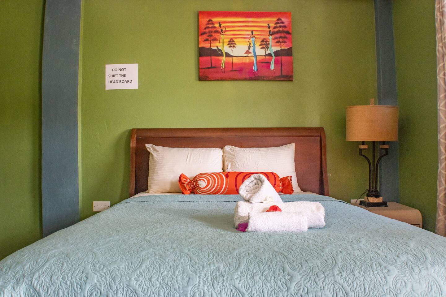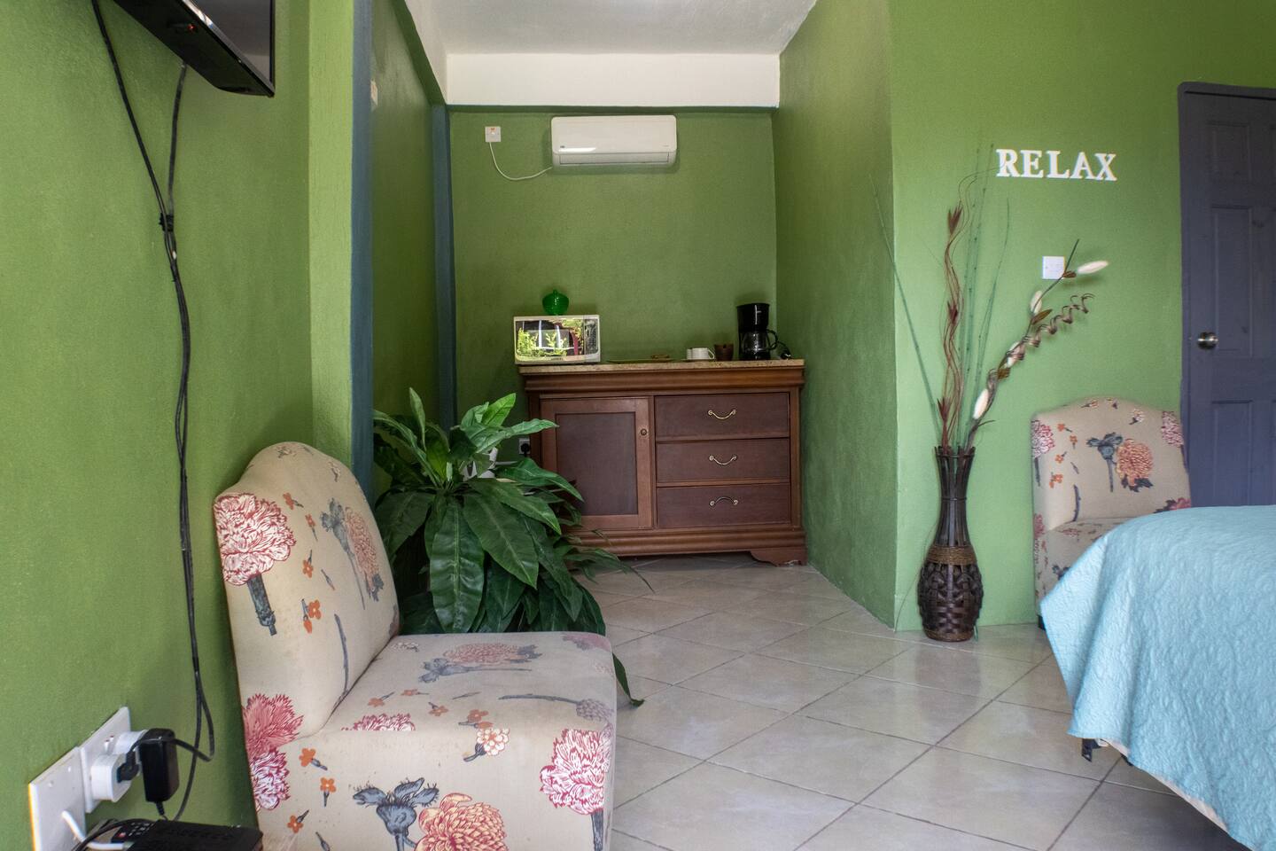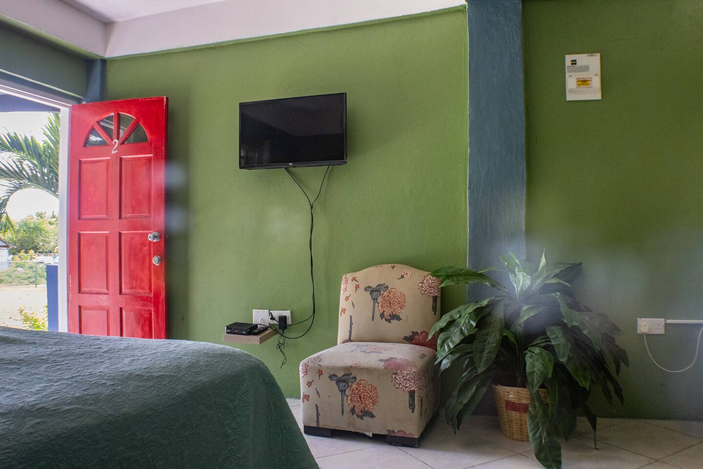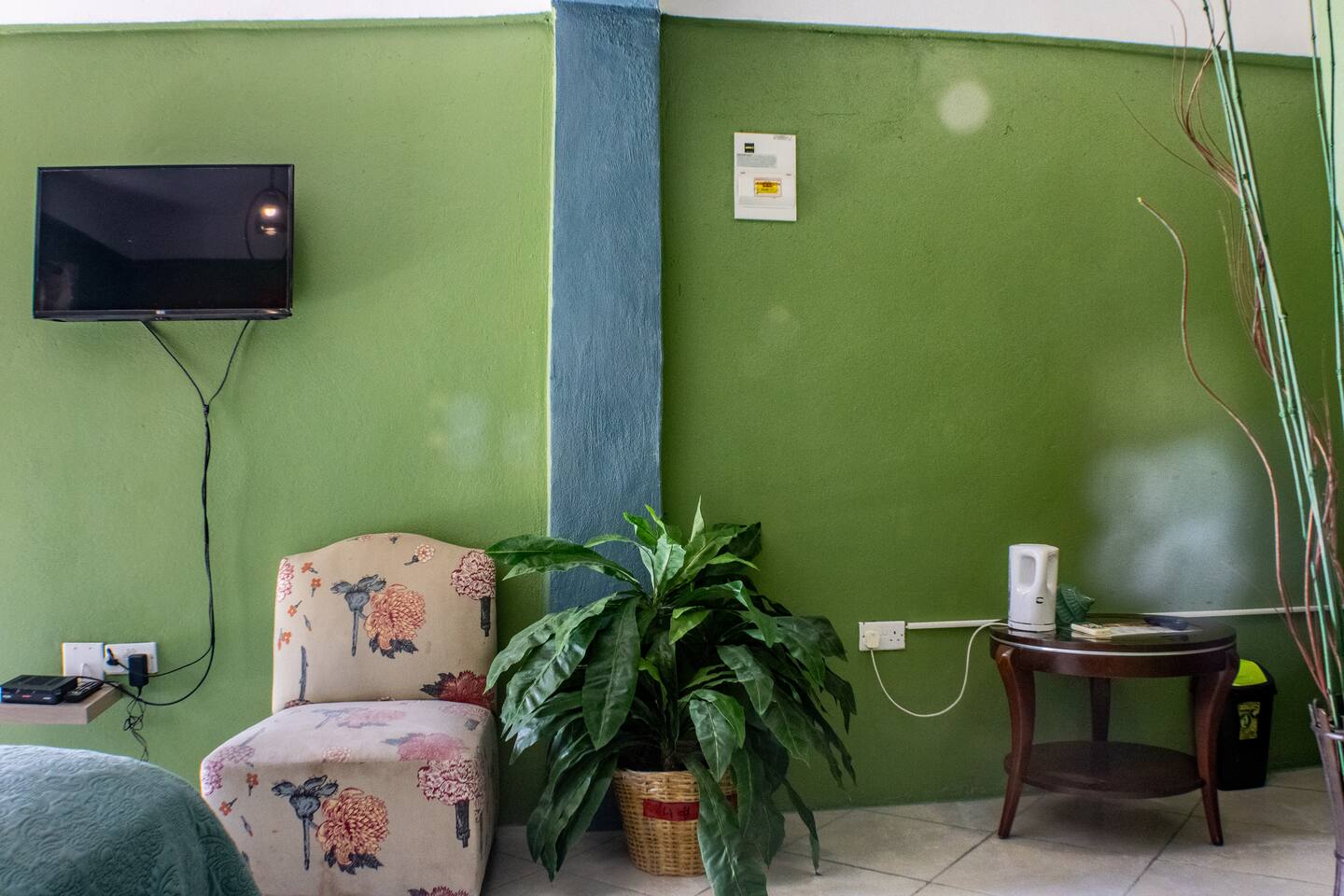 Our rooms at Lushes Lodge are designed to provide a peaceful and relaxing retreat: Comfortable Sleeping Space: Featuring a plush double bed with fresh linens and vibrant décor for a welcoming feel. Convenience in Every Detail: A mini-fridge, microwave, and basic tea essentials are included for light snacking or refreshments. Refreshing Bathroom: A clean and colorful bathroom with a unique basin design and modern shower adds charm and function to your stay. Entertainment Ready: Enjoy a mounted flat-screen TV with available channels for your downtime. Peaceful Ambiance: The calming blue and green tones of the room create a serene atmosphere, complemented by natural light through the windows. Functional Comfort: Air conditioning ensures you stay cool, while the well-thought-out layout includes a comfortable seating area for relaxation.