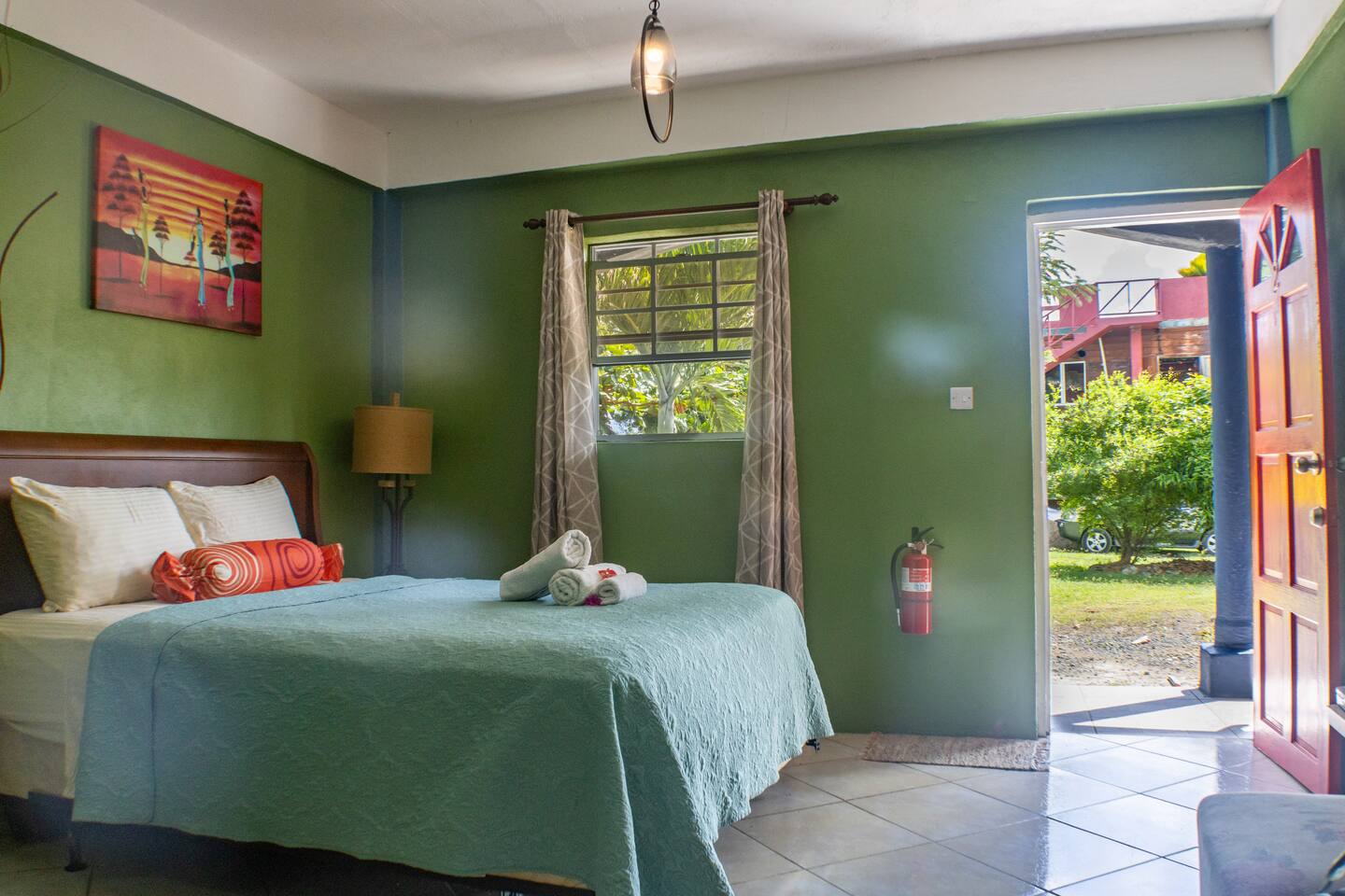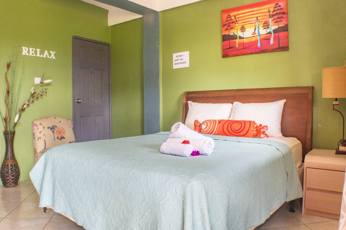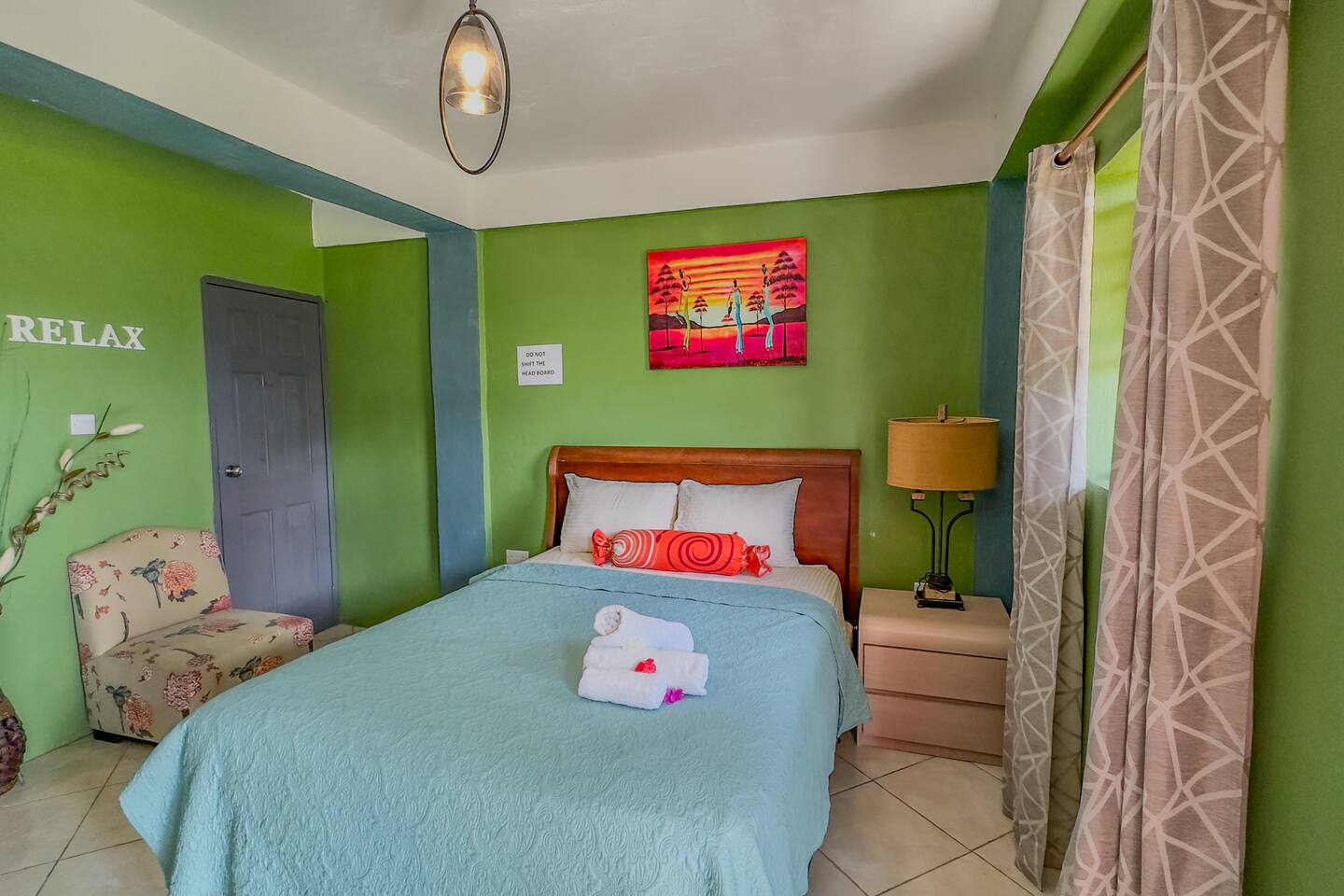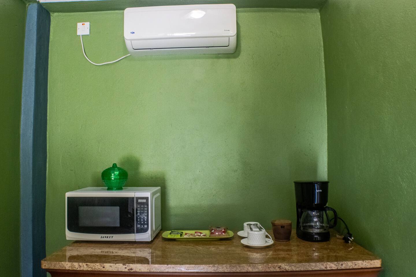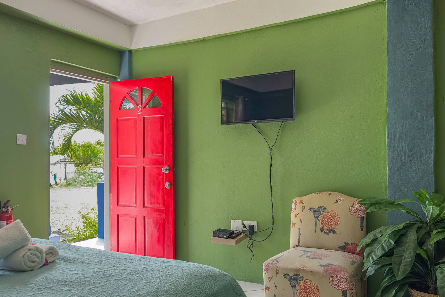 Our rooms at Lushes Lodge are designed to provide a peaceful and relaxing retreat: Comfortable Sleeping Space: Featuring a plush double bed with fresh linens and vibrant décor for a welcoming feel. Convenience in Every Detail: A mini-fridge, microwave, and basic tea essentials are included for light snacking or refreshments. Refreshing Bathroom: A clean and colorful bathroom with a unique basin design and modern shower adds charm and function to your stay. Entertainment Ready: Enjoy a mounted flat-screen TV with available channels for your downtime. Peaceful Ambiance: The calming blue and green tones of the room create a serene atmosphere, complemented by natural light through the windows. Functional Comfort: Air conditioning ensures you stay cool, while the well-thought-out layout includes a comfortable seating area for relaxation.